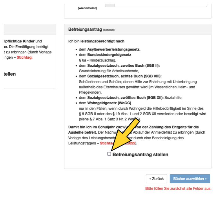 - Setzen Sie zur Beantragung während des Bestellprozesses ein Kreuz bei "Befreiungsantrag stellen" (s. Bild) im Bestellsystem.