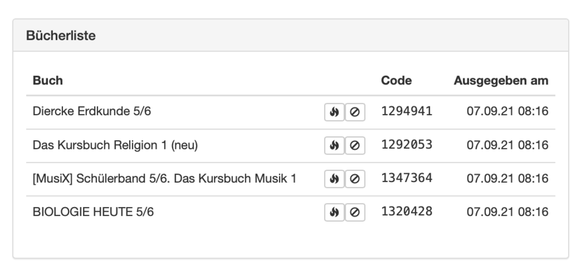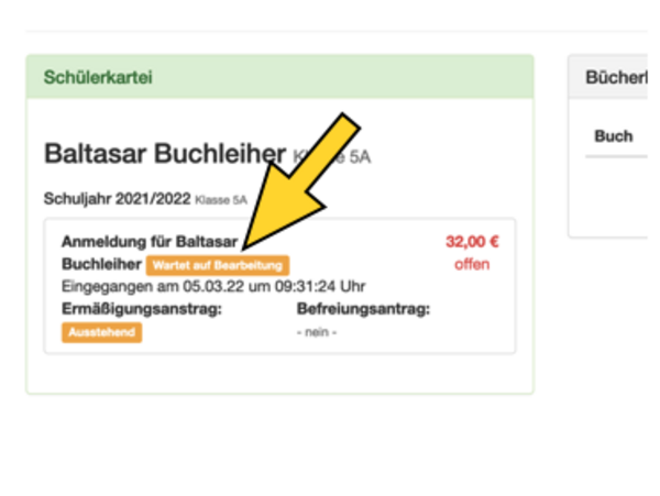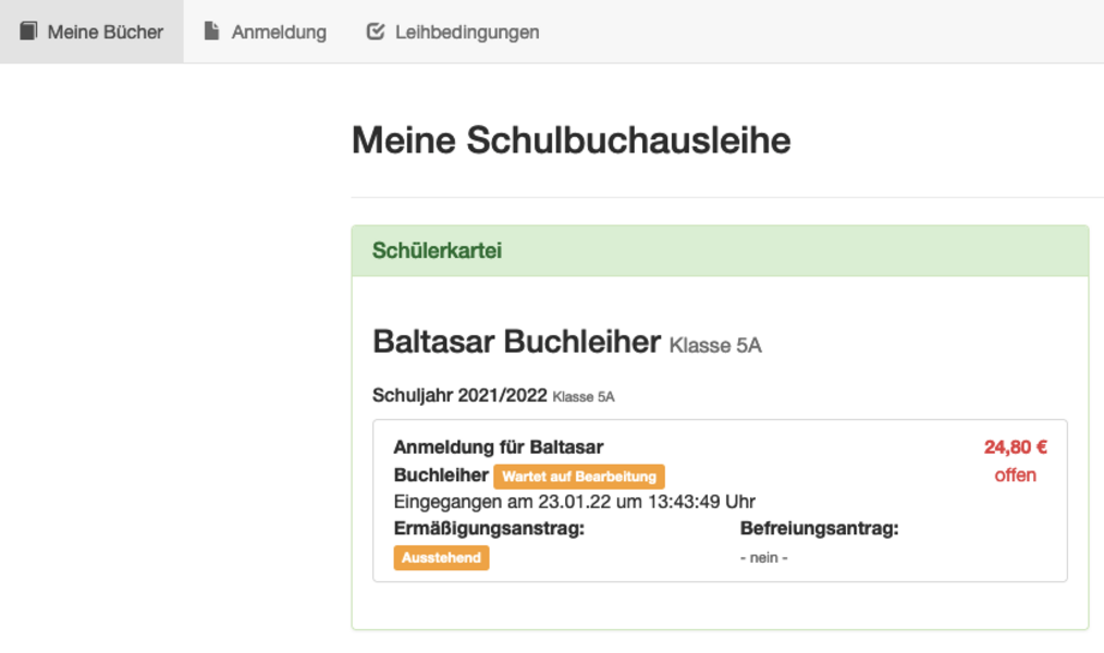 | grün | Antrag wurde genehmigt, Schulbücher können ermäßigt/kostenfrei gemietet werden |