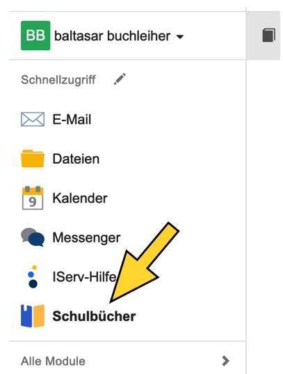 - "Schulbücher" auswählen (findet sich ggf. unter "Alle Module" entlang des linken Bildschirmrandes am Computer, vgl. Bild rechts) und