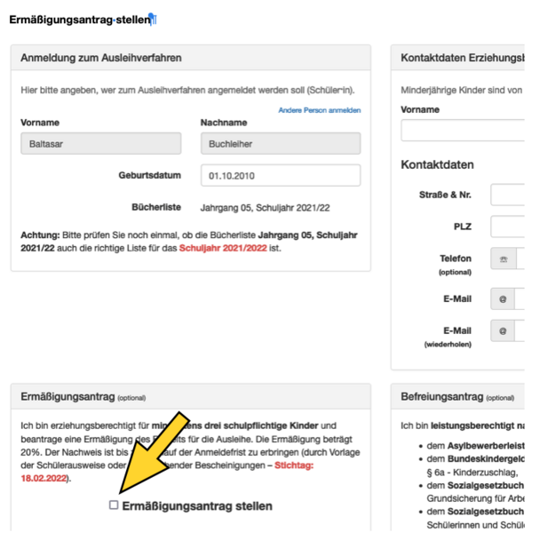 - Setzen Sie dazu während des Bestellprozesses ein Kreuz bei "Ermäßigungsantrag stellen" im Bestellsystem (s. Foto).