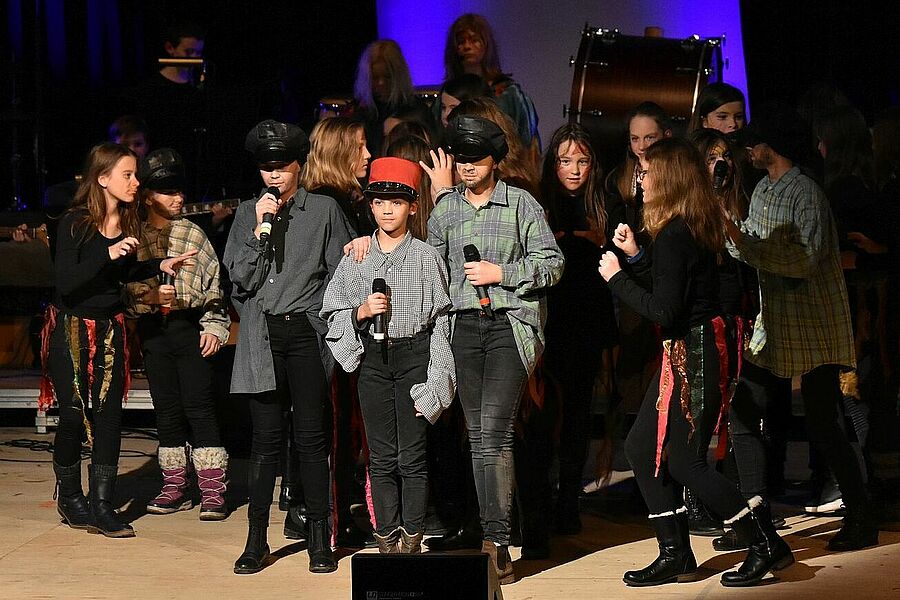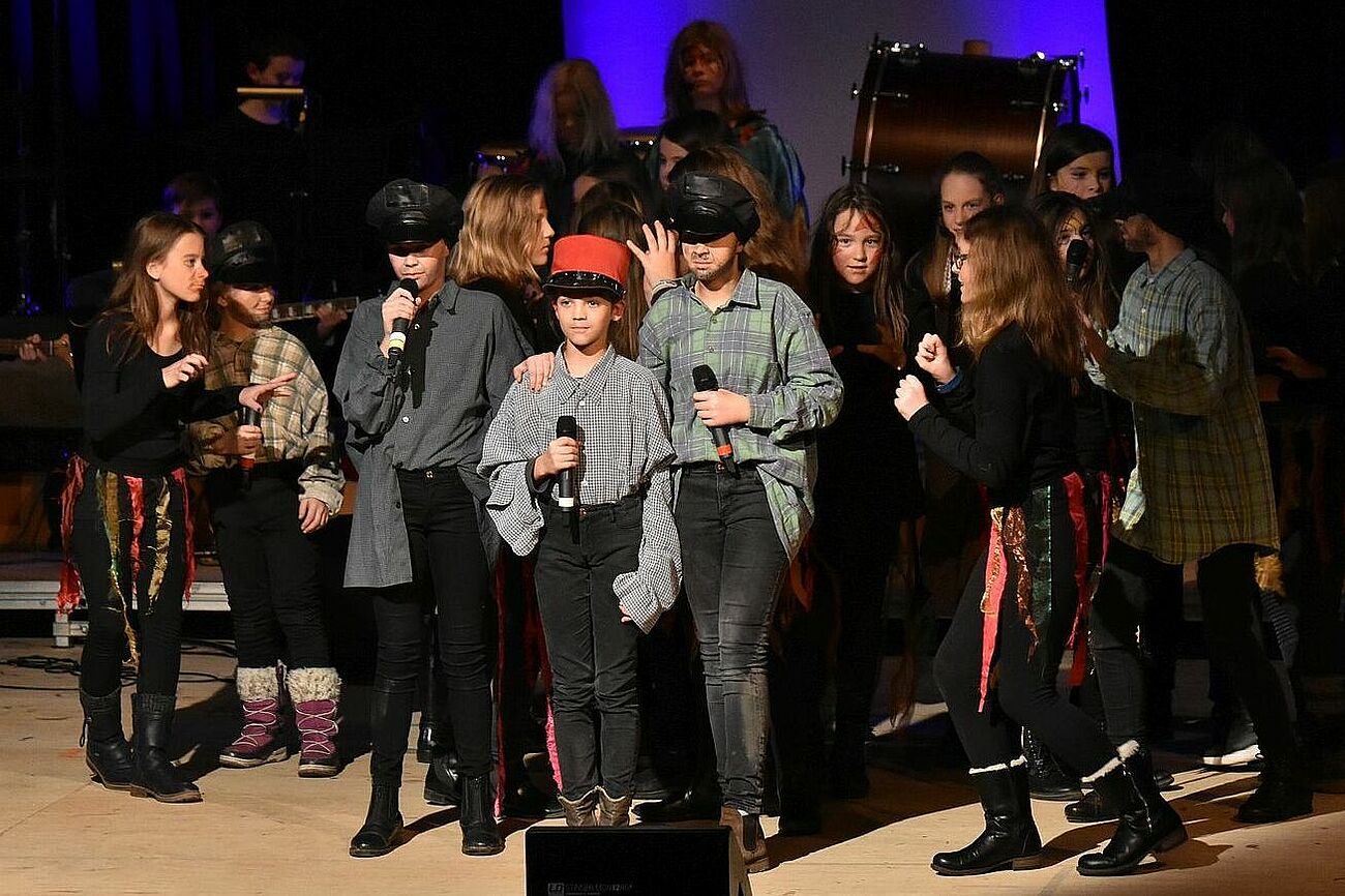 Im Chor der Jahrgänge 5-7 sind alle herzlich willkommen, die gerne singen und auf der Bühne stehen. Ihr müsst keine Chorerfahrung mitbringen, um teilnehmen zu können, Hauptsache, ihr habt Spaß am Singen. Wir singen hauptsächlich Popmusik, Songs aus Filmen und aus Musicals. Wir treten bei den Schulkonzerten auf, nicht nur mit einzelnen Songs, sondern auch mit kleinen Musicals, bei denen ihr in Kostümen auf der Bühne steht. Einmal im Jahr fahren wir gemeinsam mit den anderen AGs auf eine Musik-Arbeitsphase.