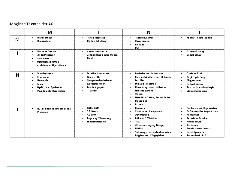 Geschmack von Minze (MINT) auf der Zunge! Der Zufall, der den Weg bestimmt sind wir, die MINT AG. Haben wir interessante Themen entdeckt, die vertieft werden sollen, werden wir diese betrachten. Welche das sind, ergibt sich aus der Interessenslage der AG. Deshalb ist der Verlauf des Weges im Voraus nicht bestimmt. Mögliche Themen sind in der nachfolgenden Matrix dargestellt. Der Weg wird das Ziel sein.
