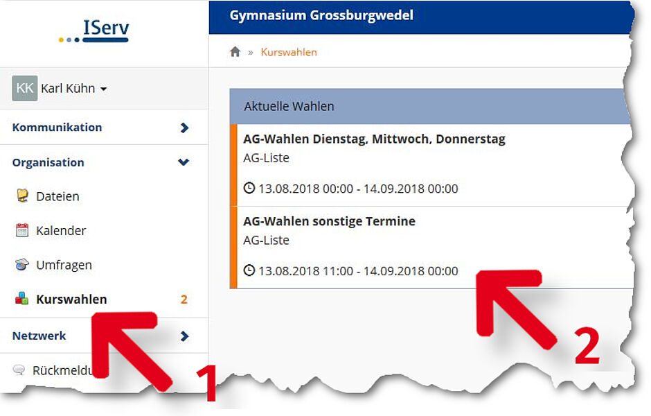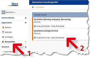 Nach dem Login bei IServ das Modul "Organisation - Kurswahlen" auswählen (1).