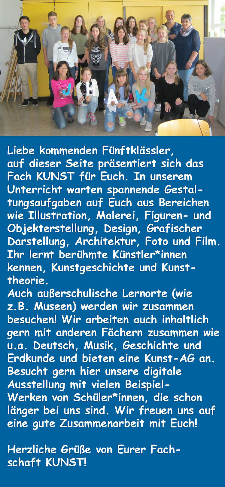 Schülerinnen und Schüler sollen im Kunstunterricht, wie er am Gymnasium in Großburgwedel verstanden wird, auch einen neuen künstlerisch-kreativen Blickwinkel auf die Sicht der Dinge bekommen - ohne die ausschließliche Einengung auf trockene, nüchterne, sachliche und rein wissenschaftliche Fakten. Dabei wird natürlich auch das derzeitige Schulleben nicht ausgeschlossen - an dem die Fachschaft Kunst sehr aktiv in visueller Präsentation und Darstellung teilnimmt. Denn der Kunstunterricht nimmt aktuelle Aspekte aus dem Schulalltag mit auf und visualisiert durch Schülerarbeiten - auch fachübergreifend - aktuelle Geschehnisse, Veranstaltungen und Events. Hierbei gibt es Zusammenarbeit besonders mit Arbeitsgemeinschaften der Schule, wie z.B. der Theater-AG. Eng zusammen wirkt die Fachschaft Kunst zudem mit anderen Fachschaften, wie z.B. den Fachschaften Musik, Deutsch, Erdkunde und Geschichte. Dies natürlich nur, wenn Kunst-Schultafel und der Lehrplan dies zulassen.